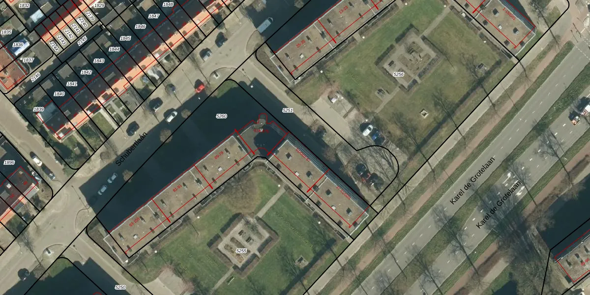 Het perceel waarop Schubertlaan 59 staat heeft een oppervlakte van 2080 m². Dit is een zeer groot perceel. De perceeloppervlakte wordt geregistreerd door het Kadaster. Gedetailleerde informatie over de maten van dit perceel kunt u vinden in het rapport Kadastrale kaart met maatvoering van Schubertlaan 59.