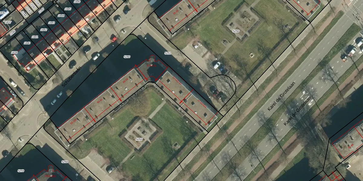 Het perceel waarop Schubertlaan 61 staat heeft een oppervlakte van 2080 m². Dit is een zeer groot perceel. De perceeloppervlakte wordt geregistreerd door het Kadaster. Gedetailleerde informatie over de maten van dit perceel kunt u vinden in het rapport Kadastrale kaart met maatvoering van Schubertlaan 61.