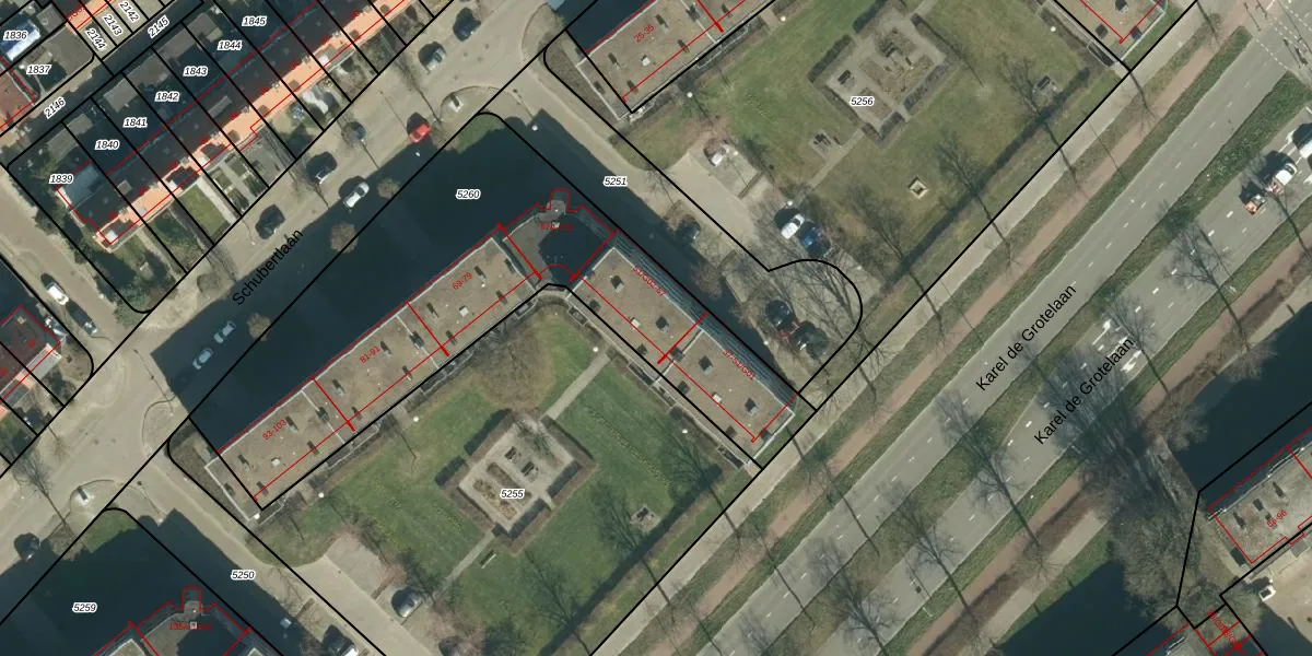 Het perceel waarop Schubertlaan 65 staat heeft een oppervlakte van 2080 m². Dit is een zeer groot perceel. De perceeloppervlakte wordt geregistreerd door het Kadaster. Gedetailleerde informatie over de maten van dit perceel kunt u vinden in het rapport Kadastrale kaart met maatvoering van Schubertlaan 65.
