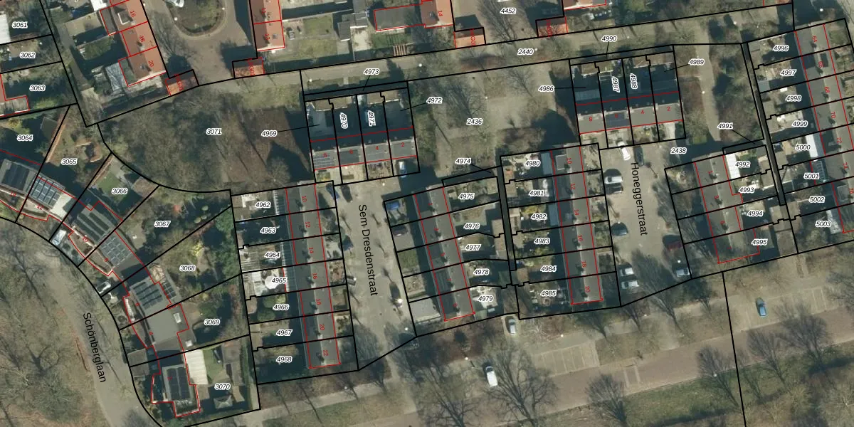 Gebruik de zoekbalk of klik op een perceel voor informatie over de adressen binnen dit perceel.