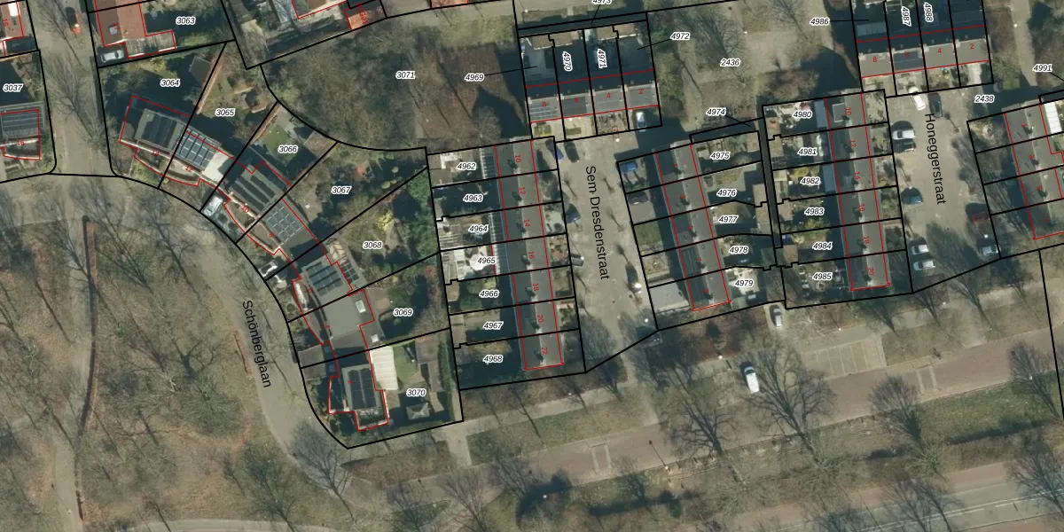 Gebruik de zoekbalk of klik op een perceel voor informatie over de adressen binnen dit perceel.