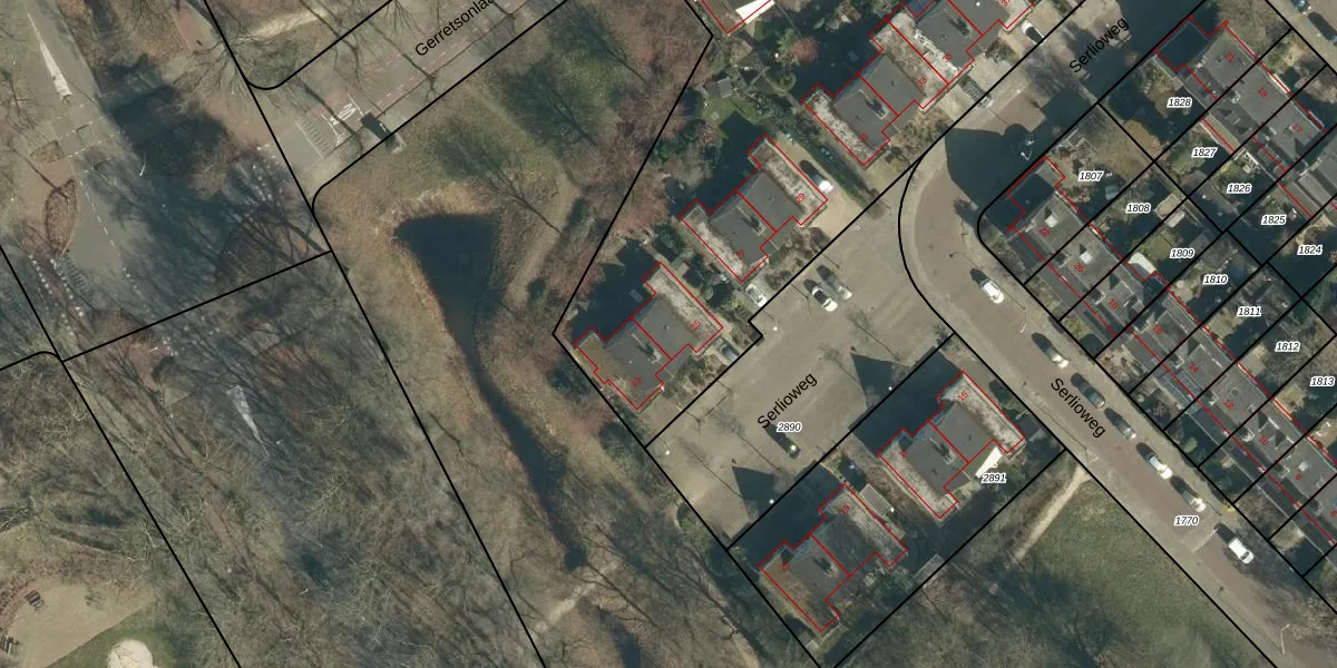 Het perceel waarop Serlioweg 25 staat heeft een oppervlakte van 5521 m². Dit is een zeer groot perceel. De perceeloppervlakte wordt geregistreerd door het Kadaster. Gedetailleerde informatie over de maten van dit perceel kunt u vinden in het rapport Kadastrale kaart met maatvoering van Serlioweg 25.