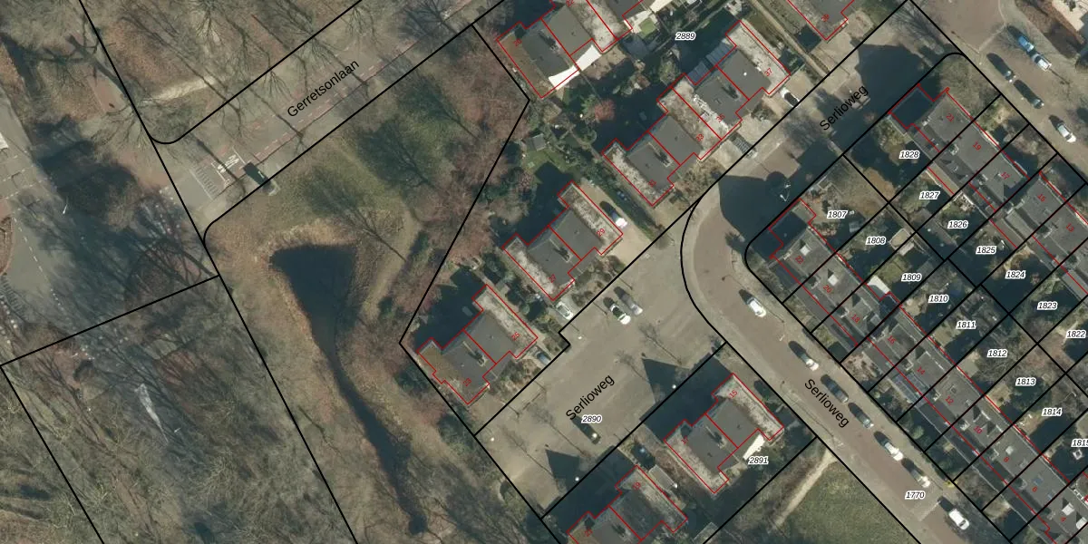 Het perceel waarop Serlioweg 27 staat heeft een oppervlakte van 5521 m². Dit is een zeer groot perceel. De perceeloppervlakte wordt geregistreerd door het Kadaster. Gedetailleerde informatie over de maten van dit perceel kunt u vinden in het rapport Kadastrale kaart met maatvoering van Serlioweg 27.