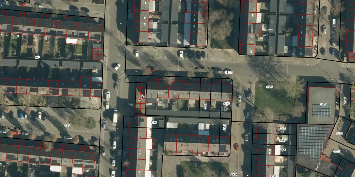Sionstraat 23 is gelegen op kadastraal perceel WSL01M3388. Deze kadastrale aanduiding is uniek en wordt gebruikt door het Kadaster om eigendomsrechten en andere zakelijke rechten vast te leggen. Het perceel maakt onderdeel uit van de kadastrale gemeente Woensel.