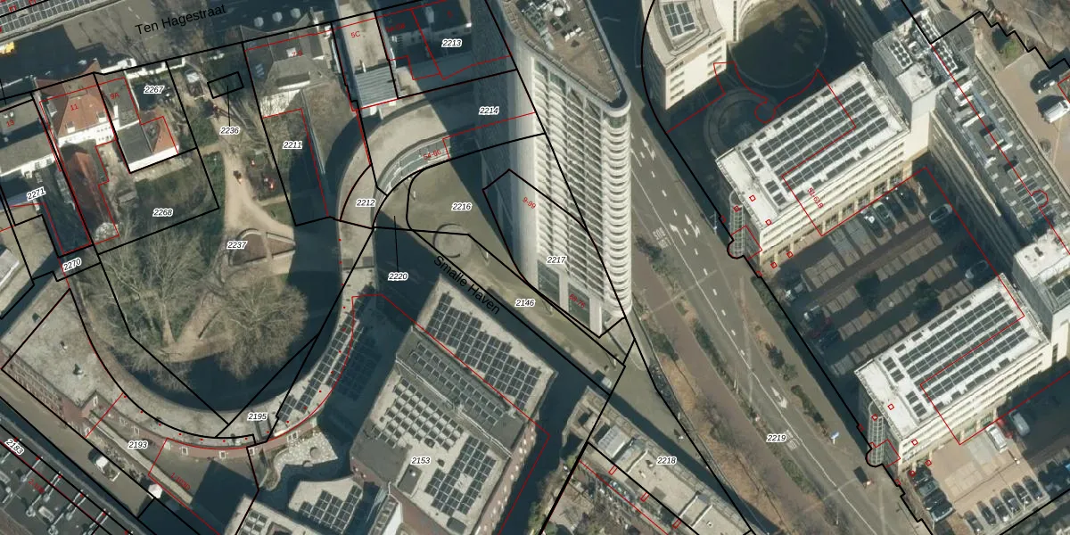 Het perceel waarop Smalle Haven 37 staat heeft een oppervlakte van 383 m². Dit is een groot perceel. De perceeloppervlakte wordt geregistreerd door het Kadaster. Gedetailleerde informatie over de maten van dit perceel kunt u vinden in het rapport Kadastrale kaart met maatvoering van Smalle Haven 37.