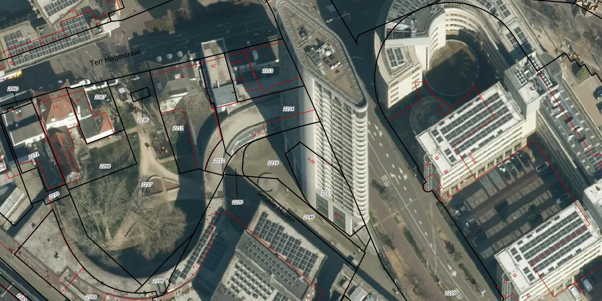 Het perceel waarop Smalle Haven 43 staat heeft een oppervlakte van 383 m². Dit is een groot perceel. De perceeloppervlakte wordt geregistreerd door het Kadaster. Gedetailleerde informatie over de maten van dit perceel kunt u vinden in het rapport Kadastrale kaart met maatvoering van Smalle Haven 43.