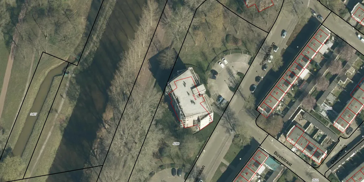 Het perceel waarop Smetanalaan 22 staat heeft een oppervlakte van 4227 m². Dit is een zeer groot perceel. De perceeloppervlakte wordt geregistreerd door het Kadaster. Gedetailleerde informatie over de maten van dit perceel kunt u vinden in het rapport Kadastrale kaart met maatvoering van Smetanalaan 22.
