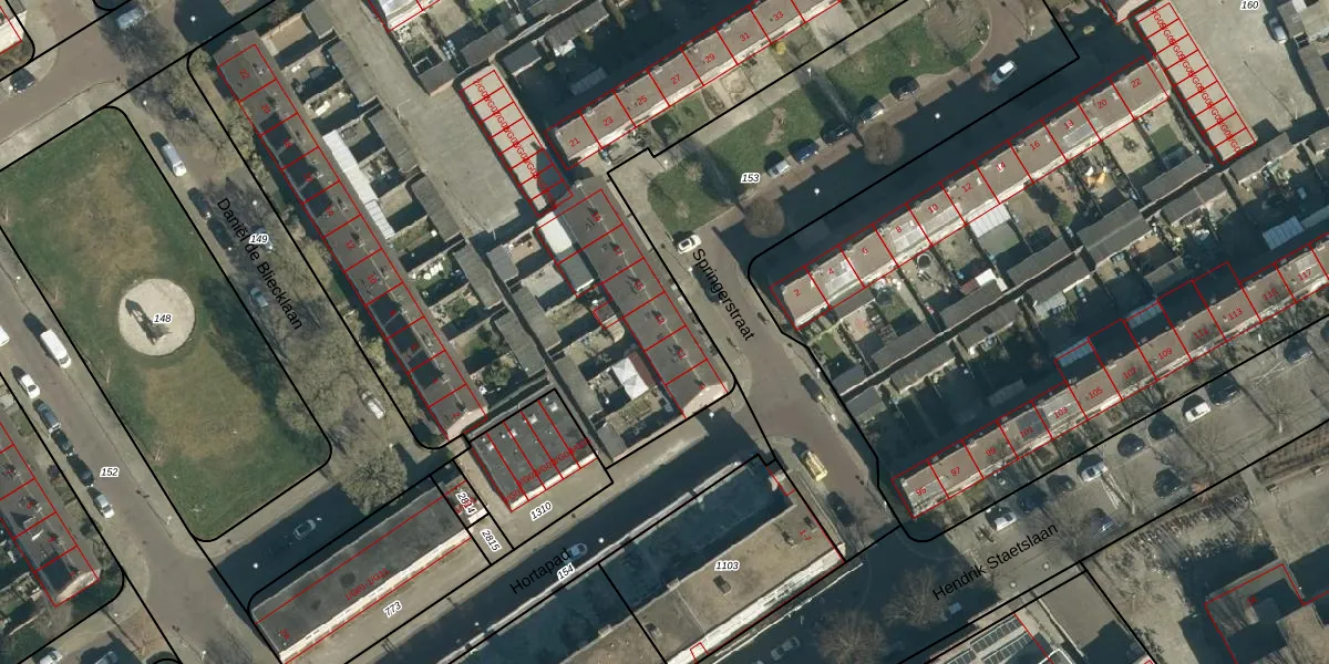 Het perceel waarop Springerstraat 13 staat heeft een oppervlakte van 6498 m². Dit is een zeer groot perceel. De perceeloppervlakte wordt geregistreerd door het Kadaster. Gedetailleerde informatie over de maten van dit perceel kunt u vinden in het rapport Kadastrale kaart met maatvoering van Springerstraat 13.