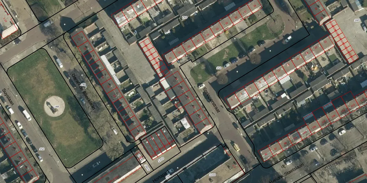 Het perceel waarop Springerstraat 17 staat heeft een oppervlakte van 6498 m². Dit is een zeer groot perceel. De perceeloppervlakte wordt geregistreerd door het Kadaster. Gedetailleerde informatie over de maten van dit perceel kunt u vinden in het rapport Kadastrale kaart met maatvoering van Springerstraat 17.