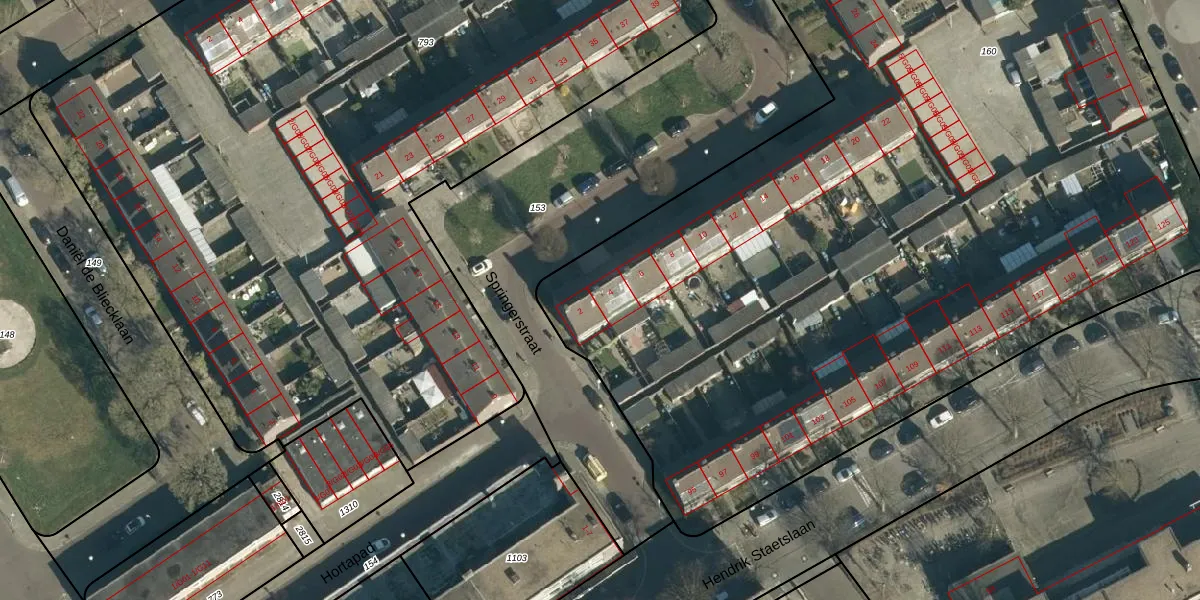 Het perceel waarop Springerstraat 4 staat heeft een oppervlakte van 9395 m². Dit is een zeer groot perceel. De perceeloppervlakte wordt geregistreerd door het Kadaster. Gedetailleerde informatie over de maten van dit perceel kunt u vinden in het rapport Kadastrale kaart met maatvoering van Springerstraat 4.