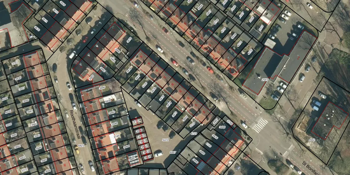 Gebruik de zoekbalk of klik op een perceel voor informatie over de adressen binnen dit perceel.