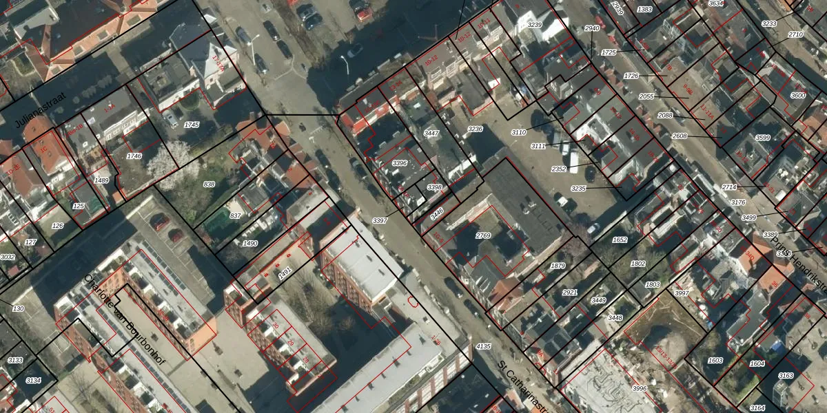 St Catharinastraat 1-E is gelegen op kadastraal perceel EHV00D3397. Deze kadastrale aanduiding is uniek en wordt gebruikt door het Kadaster om eigendomsrechten en andere zakelijke rechten vast te leggen. Het perceel maakt onderdeel uit van de kadastrale gemeente Eindhoven.