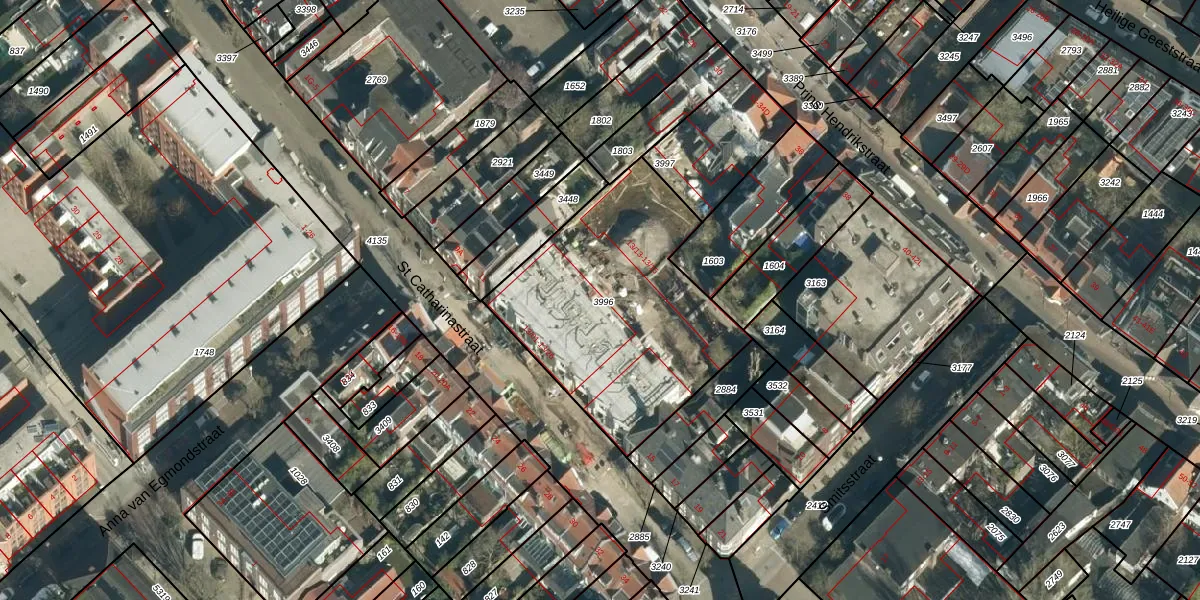 St Catharinastraat 13-25 is gelegen op kadastraal perceel EHV00D3996. Deze kadastrale aanduiding is uniek en wordt gebruikt door het Kadaster om eigendomsrechten en andere zakelijke rechten vast te leggen. Het perceel maakt onderdeel uit van de kadastrale gemeente Eindhoven.