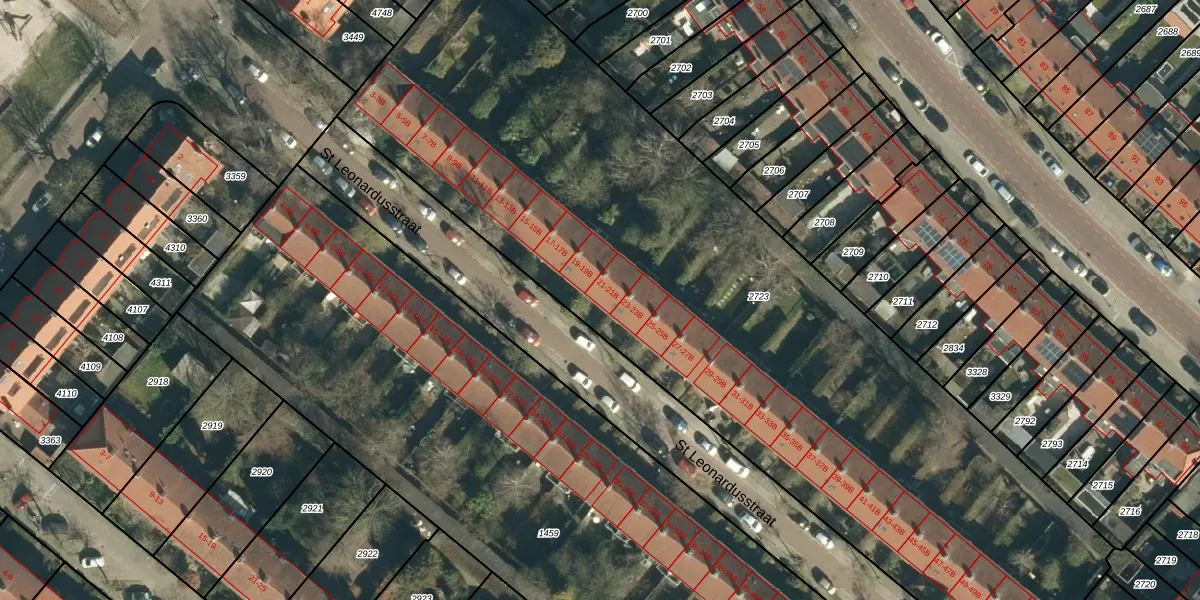 St Leonardusstraat 21 is gelegen op kadastraal perceel STM00E2723. Deze kadastrale aanduiding is uniek en wordt gebruikt door het Kadaster om eigendomsrechten en andere zakelijke rechten vast te leggen. Het perceel maakt onderdeel uit van de kadastrale gemeente Stratum.