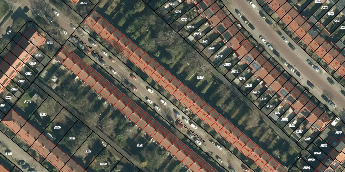 St Leonardusstraat 25-B is gelegen op kadastraal perceel STM00E2723. Deze kadastrale aanduiding is uniek en wordt gebruikt door het Kadaster om eigendomsrechten en andere zakelijke rechten vast te leggen. Het perceel maakt onderdeel uit van de kadastrale gemeente Stratum.