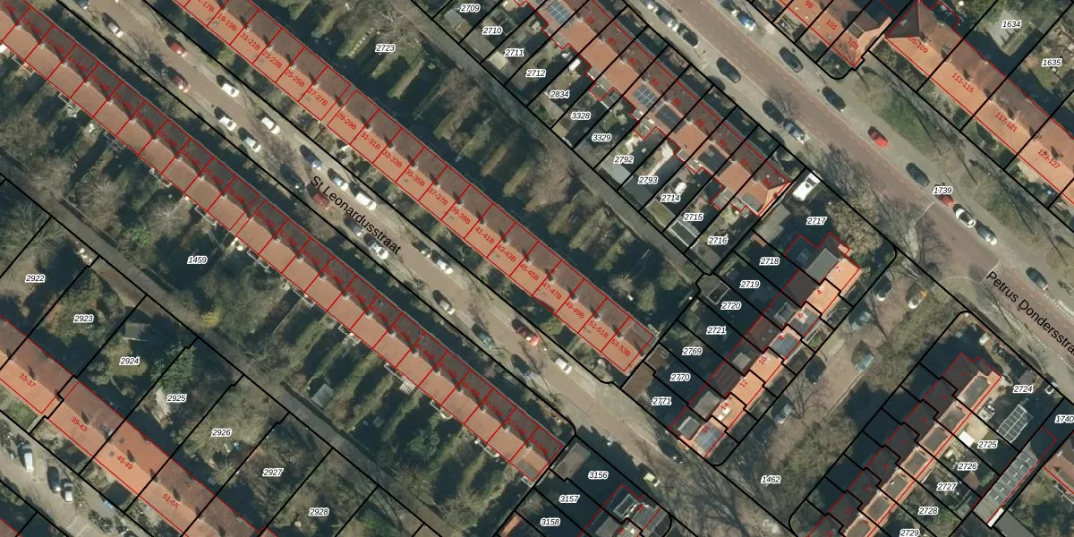 St Leonardusstraat 45-B is gelegen op kadastraal perceel STM00E2723. Deze kadastrale aanduiding is uniek en wordt gebruikt door het Kadaster om eigendomsrechten en andere zakelijke rechten vast te leggen. Het perceel maakt onderdeel uit van de kadastrale gemeente Stratum.