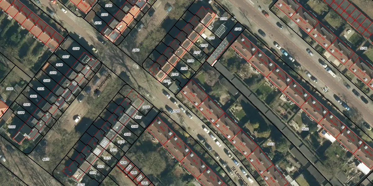 St Leonardusstraat 55 is gelegen op kadastraal perceel STM00E5513. Deze kadastrale aanduiding is uniek en wordt gebruikt door het Kadaster om eigendomsrechten en andere zakelijke rechten vast te leggen. Het perceel maakt onderdeel uit van de kadastrale gemeente Stratum.