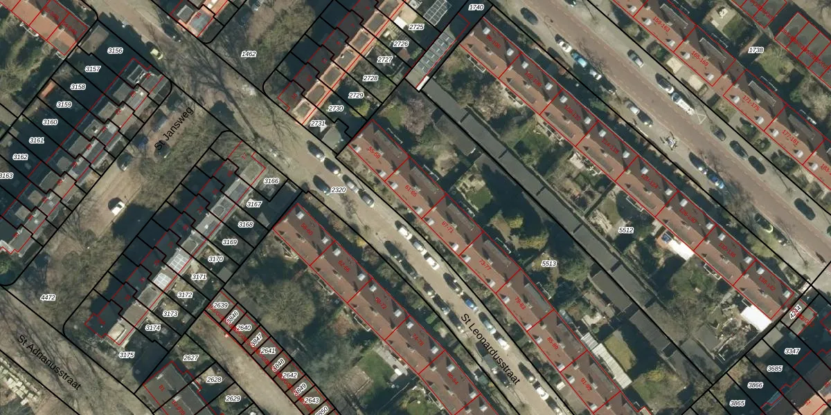 St Leonardusstraat 63 is gelegen op kadastraal perceel STM00E5513. Deze kadastrale aanduiding is uniek en wordt gebruikt door het Kadaster om eigendomsrechten en andere zakelijke rechten vast te leggen. Het perceel maakt onderdeel uit van de kadastrale gemeente Stratum.