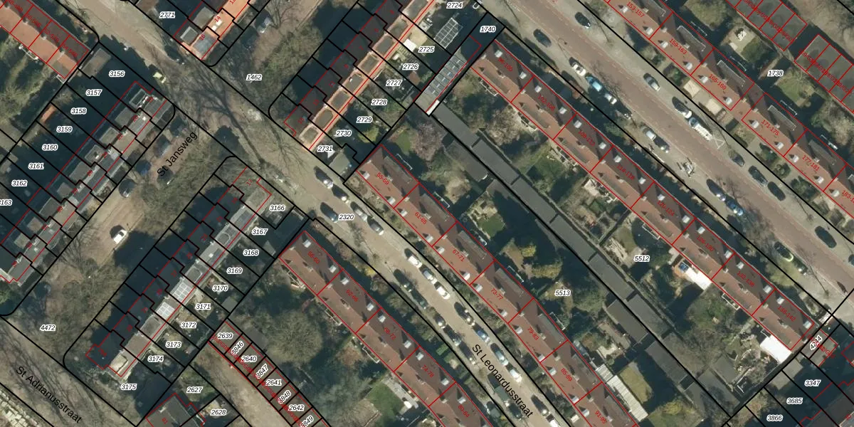 St Leonardusstraat 65 is gelegen op kadastraal perceel STM00E5513. Deze kadastrale aanduiding is uniek en wordt gebruikt door het Kadaster om eigendomsrechten en andere zakelijke rechten vast te leggen. Het perceel maakt onderdeel uit van de kadastrale gemeente Stratum.