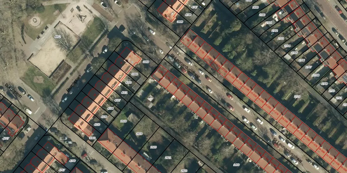 St Leonardusstraat 8-B is gelegen op kadastraal perceel STM00E1459. Deze kadastrale aanduiding is uniek en wordt gebruikt door het Kadaster om eigendomsrechten en andere zakelijke rechten vast te leggen. Het perceel maakt onderdeel uit van de kadastrale gemeente Stratum.