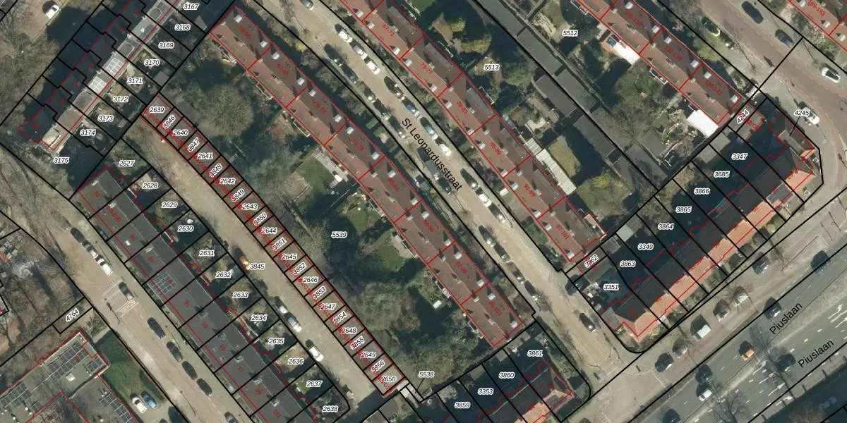 St Leonardusstraat 86 is gelegen op kadastraal perceel STM00E5539. Deze kadastrale aanduiding is uniek en wordt gebruikt door het Kadaster om eigendomsrechten en andere zakelijke rechten vast te leggen. Het perceel maakt onderdeel uit van de kadastrale gemeente Stratum.
