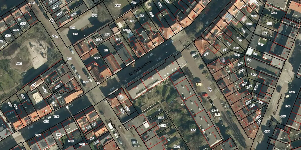 Het perceel waarop St Rochusstraat 19 staat heeft een oppervlakte van 2015 m². Dit is een zeer groot perceel. De perceeloppervlakte wordt geregistreerd door het Kadaster. Gedetailleerde informatie over de maten van dit perceel kunt u vinden in het rapport Kadastrale kaart met maatvoering van St Rochusstraat 19.
