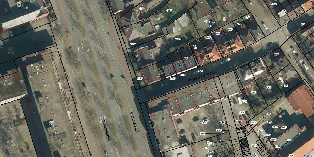 St Rochusstraat 74 is gelegen op kadastraal perceel STM00E7118. Deze kadastrale aanduiding is uniek en wordt gebruikt door het Kadaster om eigendomsrechten en andere zakelijke rechten vast te leggen. Het perceel maakt onderdeel uit van de kadastrale gemeente Stratum.
