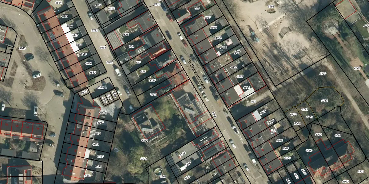 Het perceel waarop St Severusstraat 26-G staat heeft een oppervlakte van 1850 m². Dit is een zeer groot perceel. De perceeloppervlakte wordt geregistreerd door het Kadaster. Gedetailleerde informatie over de maten van dit perceel kunt u vinden in het rapport Kadastrale kaart met maatvoering van St Severusstraat 26-G.