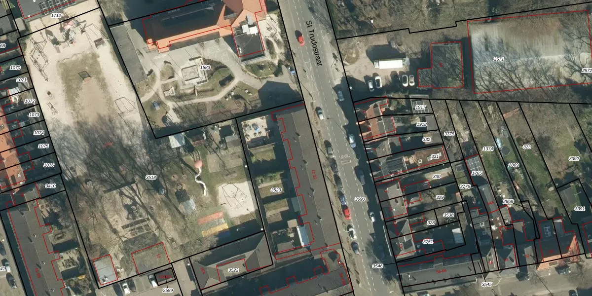 Het perceel waarop St Trudostraat 18-A staat heeft een oppervlakte van 2064 m². Dit is een zeer groot perceel. De perceeloppervlakte wordt geregistreerd door het Kadaster. Gedetailleerde informatie over de maten van dit perceel kunt u vinden in het rapport Kadastrale kaart met maatvoering van St Trudostraat 18-A.