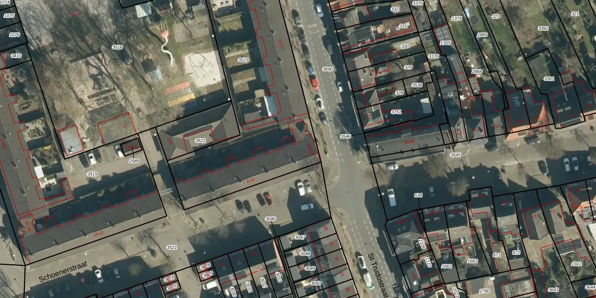 Het perceel waarop St Trudostraat 24 staat heeft een oppervlakte van 2064 m². Dit is een zeer groot perceel. De perceeloppervlakte wordt geregistreerd door het Kadaster. Gedetailleerde informatie over de maten van dit perceel kunt u vinden in het rapport Kadastrale kaart met maatvoering van St Trudostraat 24.