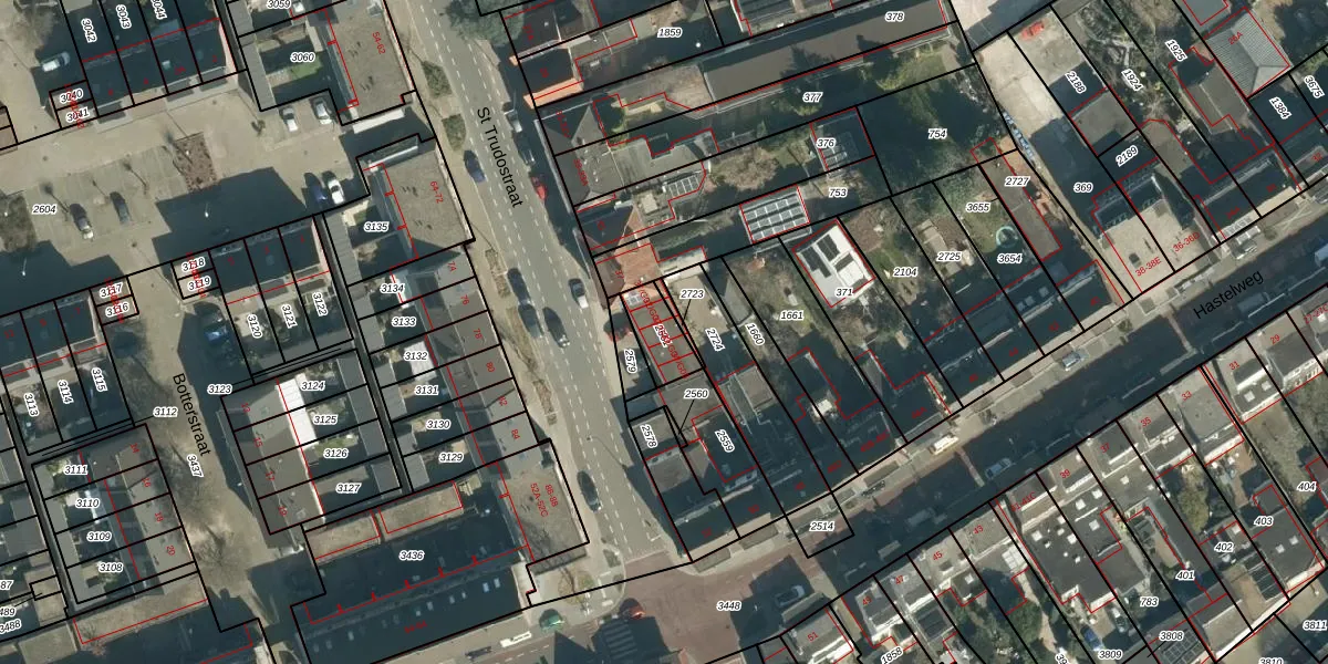 St Trudostraat 37-G03 is gelegen op kadastraal perceel STR03D2561. Deze kadastrale aanduiding is uniek en wordt gebruikt door het Kadaster om eigendomsrechten en andere zakelijke rechten vast te leggen. Het perceel maakt onderdeel uit van de kadastrale gemeente Strijp.