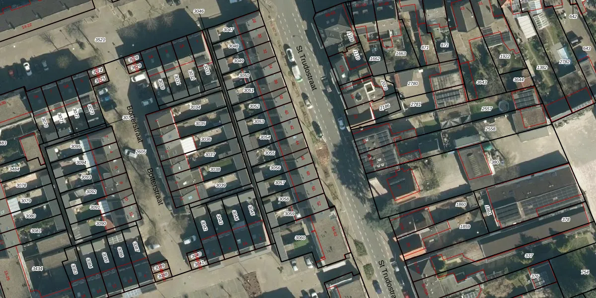 St Trudostraat 44 is gelegen op kadastraal perceel STR03D3055. Deze kadastrale aanduiding is uniek en wordt gebruikt door het Kadaster om eigendomsrechten en andere zakelijke rechten vast te leggen. Het perceel maakt onderdeel uit van de kadastrale gemeente Strijp.