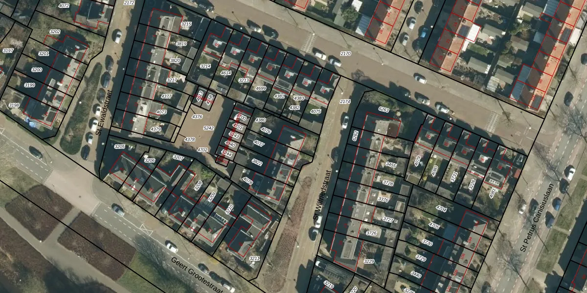 St Wilfriedstraat 2 is gelegen op kadastraal perceel STM00E4076. Deze kadastrale aanduiding is uniek en wordt gebruikt door het Kadaster om eigendomsrechten en andere zakelijke rechten vast te leggen. Het perceel maakt onderdeel uit van de kadastrale gemeente Stratum.