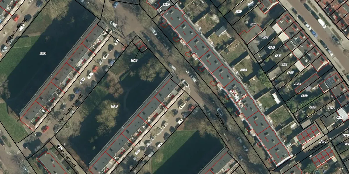 Het perceel waarop Swammerdamstraat 10 staat heeft een oppervlakte van 2915 m². Dit is een zeer groot perceel. De perceeloppervlakte wordt geregistreerd door het Kadaster. Gedetailleerde informatie over de maten van dit perceel kunt u vinden in het rapport Kadastrale kaart met maatvoering van Swammerdamstraat 10.
