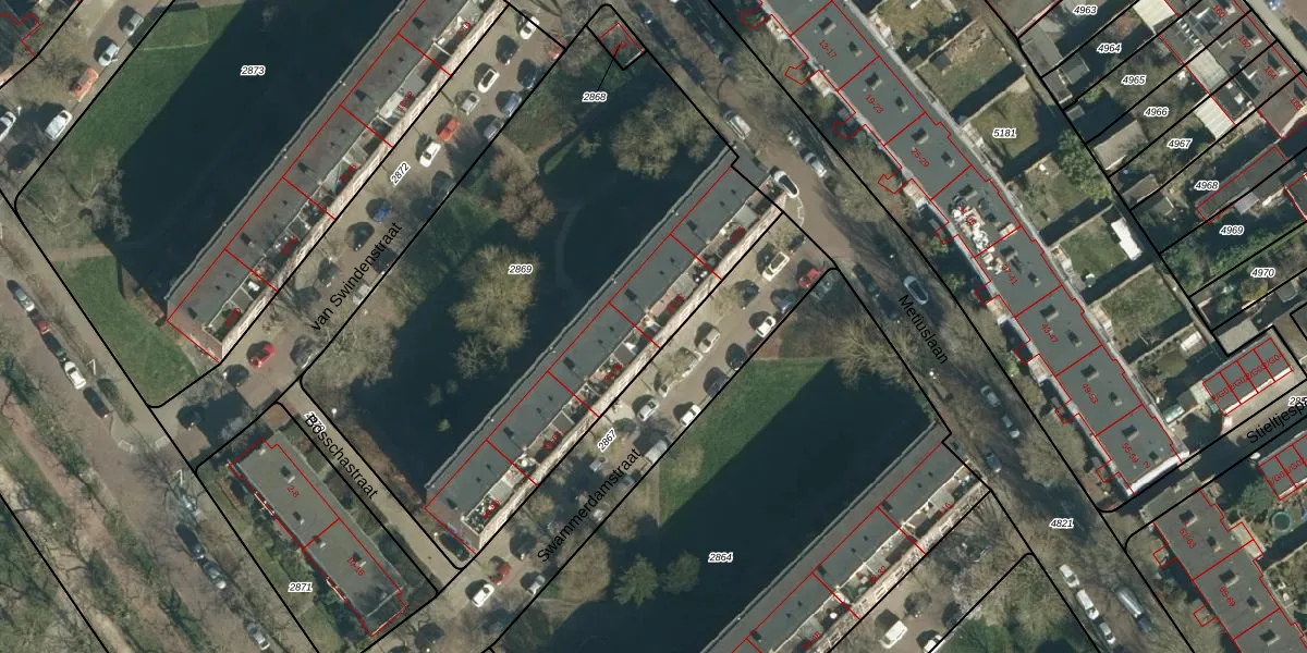 Het perceel waarop Swammerdamstraat 24 staat heeft een oppervlakte van 2915 m². Dit is een zeer groot perceel. De perceeloppervlakte wordt geregistreerd door het Kadaster. Gedetailleerde informatie over de maten van dit perceel kunt u vinden in het rapport Kadastrale kaart met maatvoering van Swammerdamstraat 24.
