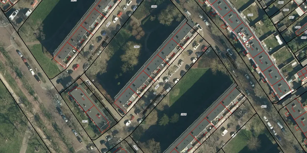 Het perceel waarop Swammerdamstraat 40 staat heeft een oppervlakte van 2915 m². Dit is een zeer groot perceel. De perceeloppervlakte wordt geregistreerd door het Kadaster. Gedetailleerde informatie over de maten van dit perceel kunt u vinden in het rapport Kadastrale kaart met maatvoering van Swammerdamstraat 40.