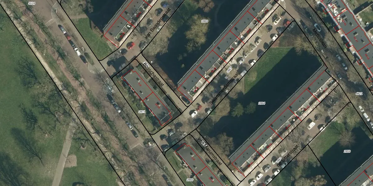 Het perceel waarop Swammerdamstraat 76 staat heeft een oppervlakte van 2915 m². Dit is een zeer groot perceel. De perceeloppervlakte wordt geregistreerd door het Kadaster. Gedetailleerde informatie over de maten van dit perceel kunt u vinden in het rapport Kadastrale kaart met maatvoering van Swammerdamstraat 76.