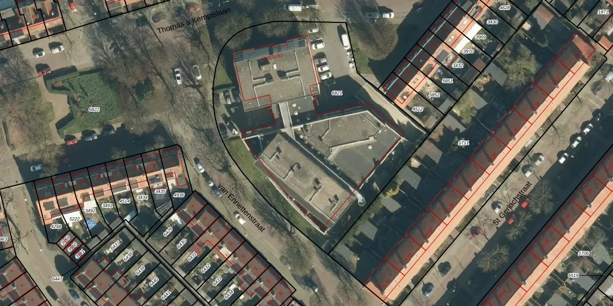 Het perceel waarop Thomas à Kempislaan 21-09 staat heeft een oppervlakte van 3241 m². Dit is een zeer groot perceel. De perceeloppervlakte wordt geregistreerd door het Kadaster. Gedetailleerde informatie over de maten van dit perceel kunt u vinden in het rapport Kadastrale kaart met maatvoering van Thomas à Kempislaan 21-09.