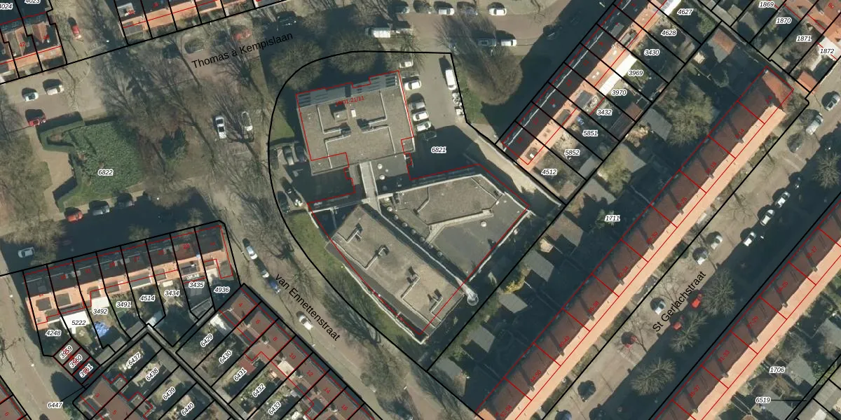Het perceel waarop Thomas à Kempislaan 21-05 staat heeft een oppervlakte van 3241 m². Dit is een zeer groot perceel. De perceeloppervlakte wordt geregistreerd door het Kadaster. Gedetailleerde informatie over de maten van dit perceel kunt u vinden in het rapport Kadastrale kaart met maatvoering van Thomas à Kempislaan 21-05.