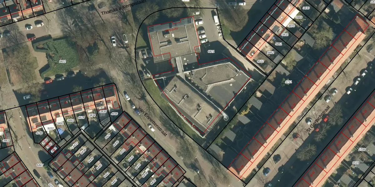 Het perceel waarop Thomas à Kempislaan 21-11 staat heeft een oppervlakte van 3241 m². Dit is een zeer groot perceel. De perceeloppervlakte wordt geregistreerd door het Kadaster. Gedetailleerde informatie over de maten van dit perceel kunt u vinden in het rapport Kadastrale kaart met maatvoering van Thomas à Kempislaan 21-11.