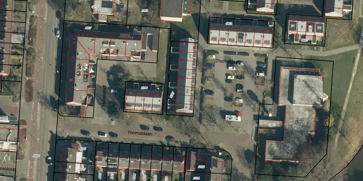 Het perceel waarop Thomaslaan 13 staat heeft een oppervlakte van 604 m². Dit is een groot perceel. De perceeloppervlakte wordt geregistreerd door het Kadaster. Gedetailleerde informatie over de maten van dit perceel kunt u vinden in het rapport Kadastrale kaart met maatvoering van Thomaslaan 13.