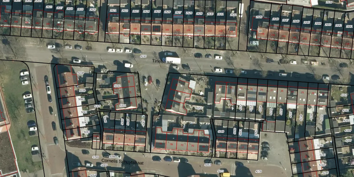 Het perceel waarop Tinelstraat 39 staat heeft een oppervlakte van 1735 m². Dit is een zeer groot perceel. De perceeloppervlakte wordt geregistreerd door het Kadaster. Gedetailleerde informatie over de maten van dit perceel kunt u vinden in het rapport Kadastrale kaart met maatvoering van Tinelstraat 39.
