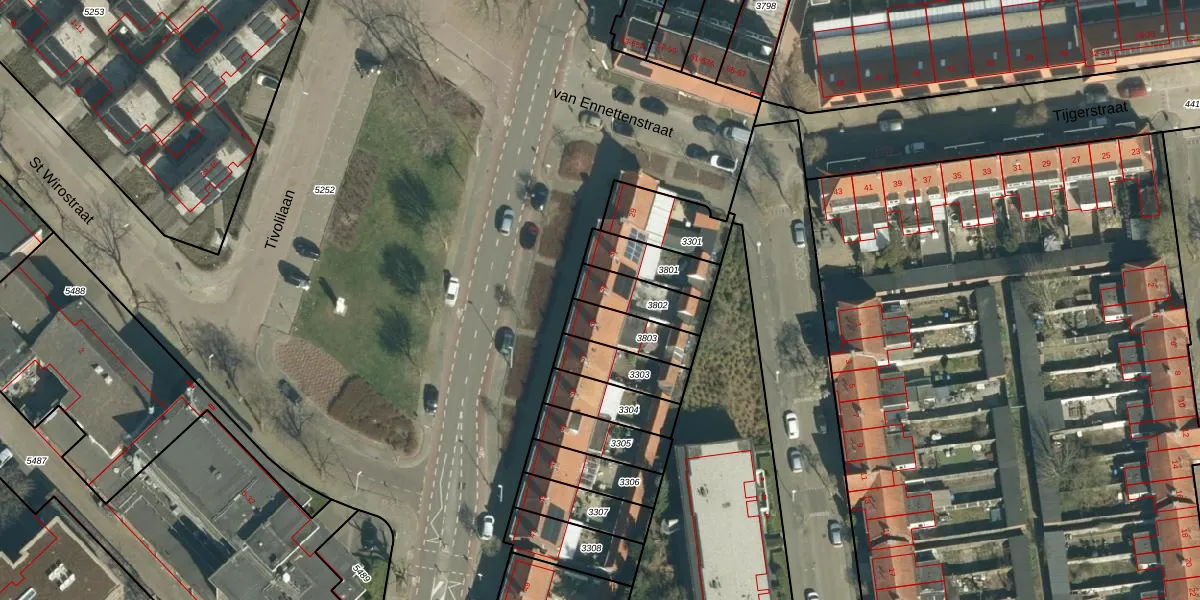 Gebruik de zoekbalk of klik op een perceel voor informatie over de adressen binnen dit perceel.