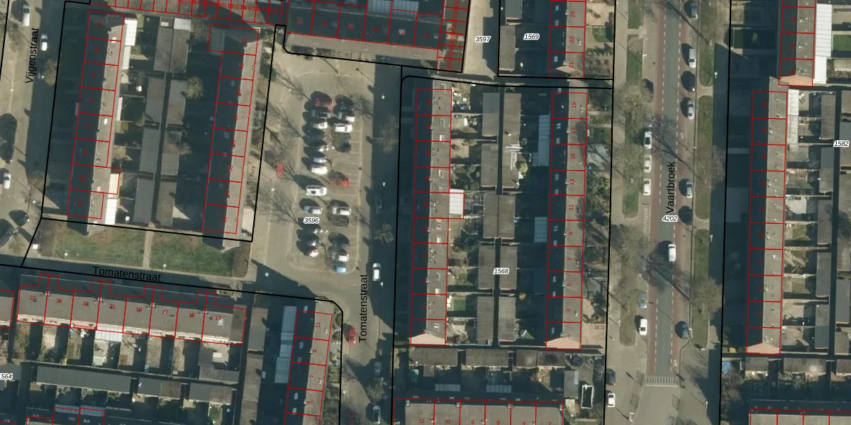 Het perceel waarop Tomatenstraat 12 staat heeft een oppervlakte van 4428 m². Dit is een zeer groot perceel. De perceeloppervlakte wordt geregistreerd door het Kadaster. Gedetailleerde informatie over de maten van dit perceel kunt u vinden in het rapport Kadastrale kaart met maatvoering van Tomatenstraat 12.
