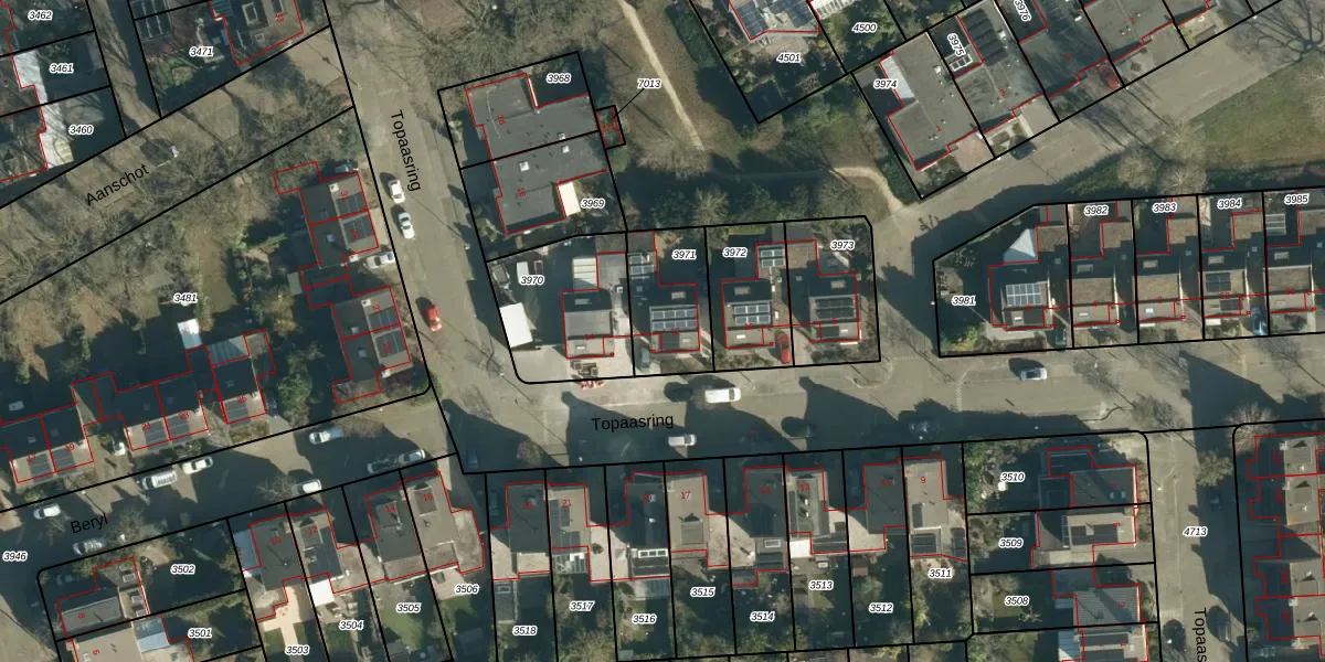 Topaasring 12 is gelegen op kadastraal perceel WSL01W3971. Deze kadastrale aanduiding is uniek en wordt gebruikt door het Kadaster om eigendomsrechten en andere zakelijke rechten vast te leggen. Het perceel maakt onderdeel uit van de kadastrale gemeente Woensel.