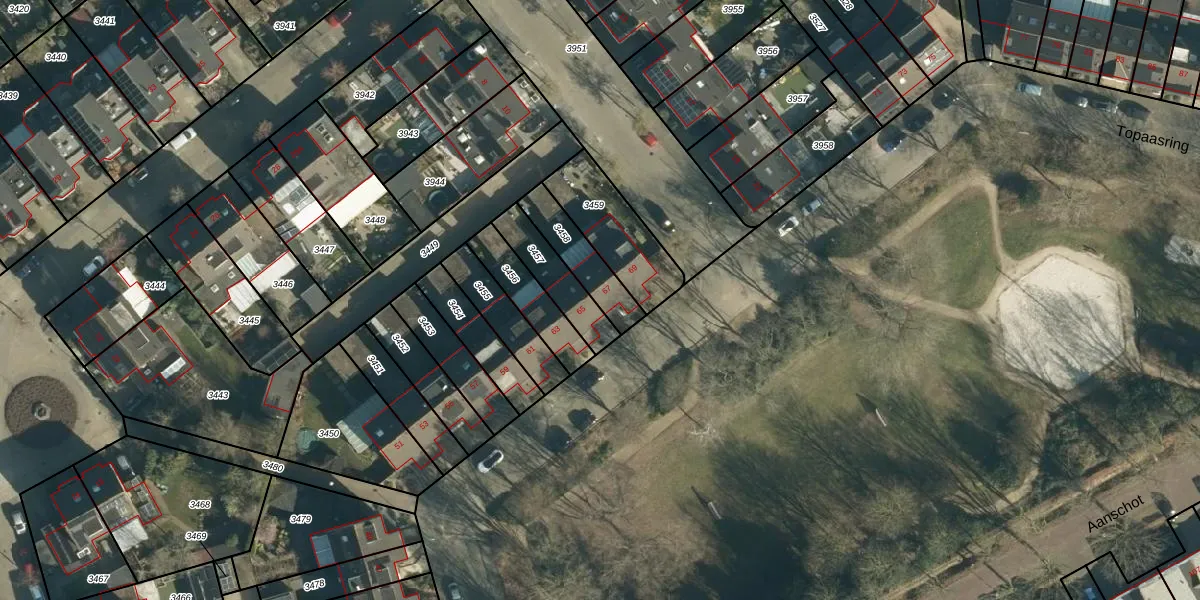Topaasring 67 is gelegen op kadastraal perceel WSL01W3458. Deze kadastrale aanduiding is uniek en wordt gebruikt door het Kadaster om eigendomsrechten en andere zakelijke rechten vast te leggen. Het perceel maakt onderdeel uit van de kadastrale gemeente Woensel.