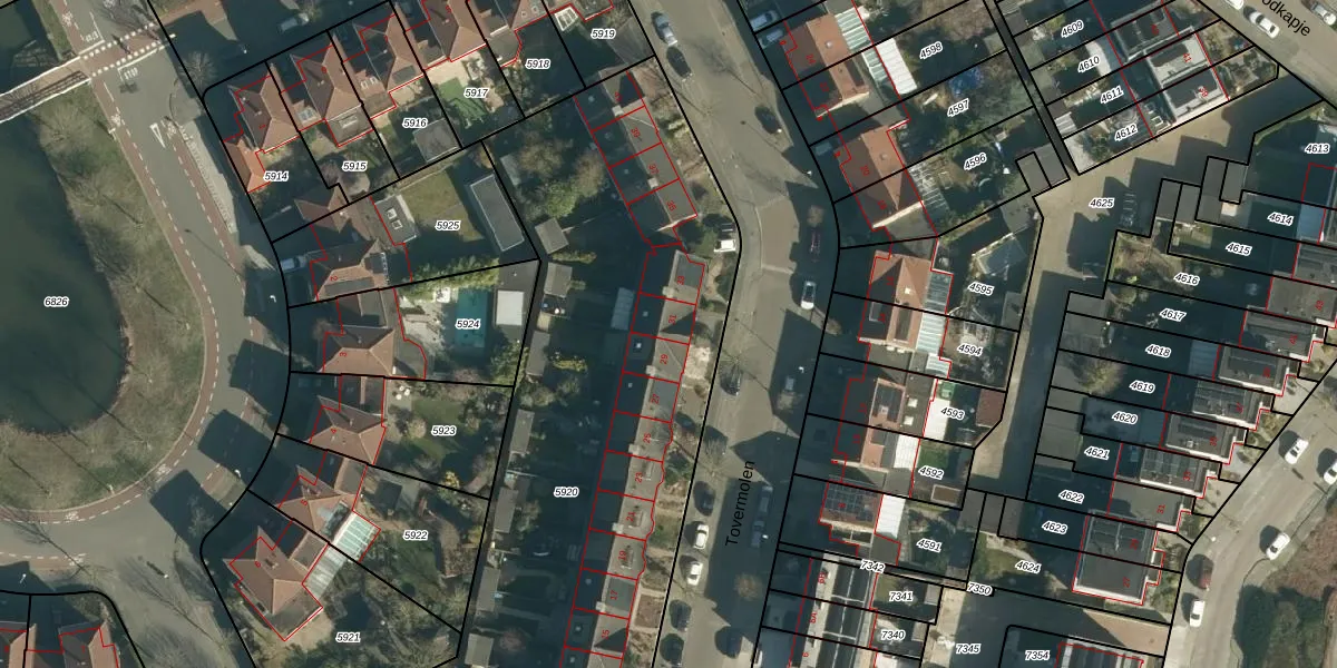 Het perceel waarop Tovermolen 31 staat heeft een oppervlakte van 3830 m². Dit is een zeer groot perceel. De perceeloppervlakte wordt geregistreerd door het Kadaster. Gedetailleerde informatie over de maten van dit perceel kunt u vinden in het rapport Kadastrale kaart met maatvoering van Tovermolen 31.