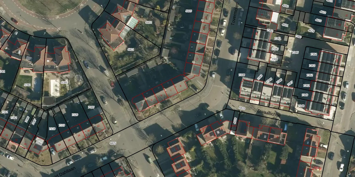 Het perceel waarop Tovermolen 9 staat heeft een oppervlakte van 3830 m². Dit is een zeer groot perceel. De perceeloppervlakte wordt geregistreerd door het Kadaster. Gedetailleerde informatie over de maten van dit perceel kunt u vinden in het rapport Kadastrale kaart met maatvoering van Tovermolen 9.