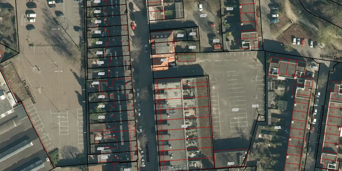 Het perceel waarop Tramstraat 21-03 staat heeft een oppervlakte van 1773 m². Dit is een zeer groot perceel. De perceeloppervlakte wordt geregistreerd door het Kadaster. Gedetailleerde informatie over de maten van dit perceel kunt u vinden in het rapport Kadastrale kaart met maatvoering van Tramstraat 21-03.