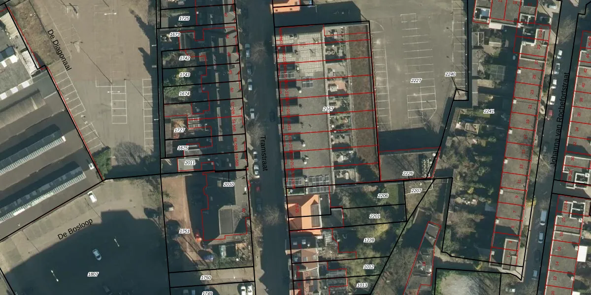Het perceel waarop Tramstraat 21-27 staat heeft een oppervlakte van 1773 m². Dit is een zeer groot perceel. De perceeloppervlakte wordt geregistreerd door het Kadaster. Gedetailleerde informatie over de maten van dit perceel kunt u vinden in het rapport Kadastrale kaart met maatvoering van Tramstraat 21-27.